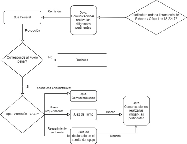 I.- Recepción y derivación: ingresada la comunicación por el Sistema de Bus Federal, el encargado del Dpto. de Admisión compulsará el requerimiento y comunicaciones procesales provenientes de otras jurisdicciones judiciales a los fines de corroborar: